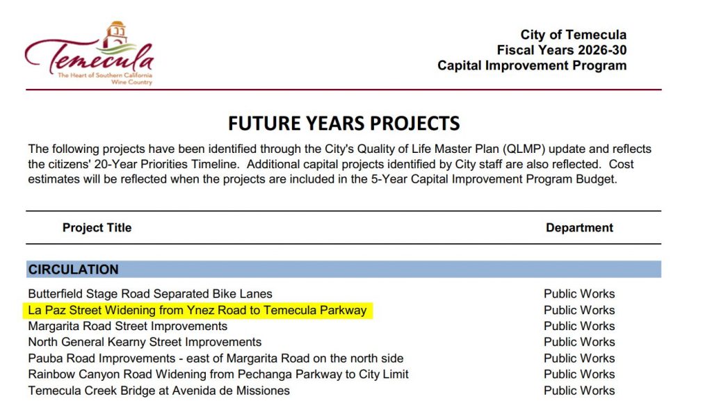 On October 15, 2025, at 6:00 p.m., the Planning Commission will vote on an amendment to the FY2026–2030 Capital Improvement Plan (CIP) to include the widening of La Paz Road from Ynez Road to Temecula Parkway. The current 2026–2030 CIP already includes the widening of Ynez Road from Santiago Road to La Paz Road.