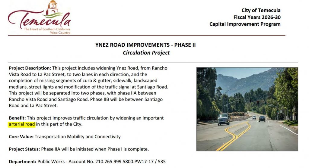The agenda mentions phase 1 of the widening ( Santiago Rd to La Paz Rd). The plans for this were designed back in 2020 . If you want to see how this section will look once completed, take a look at the maps showing current properties with proposed widening, in the 2020 article called “City is moving forward with Ynez Rd widening“.